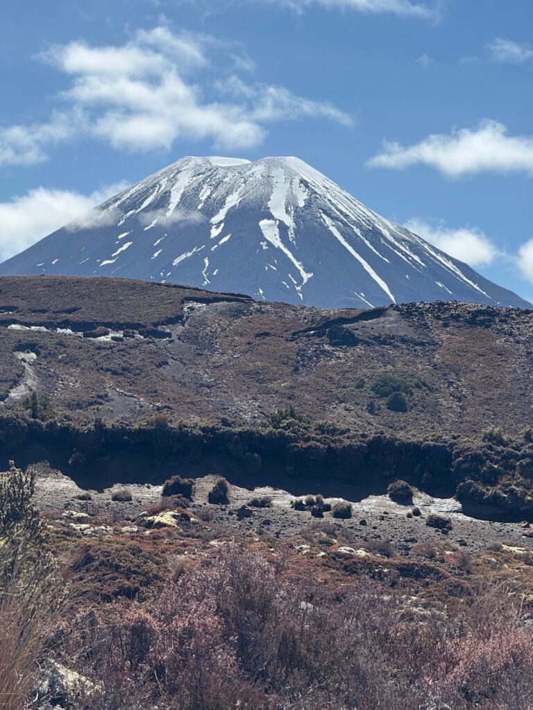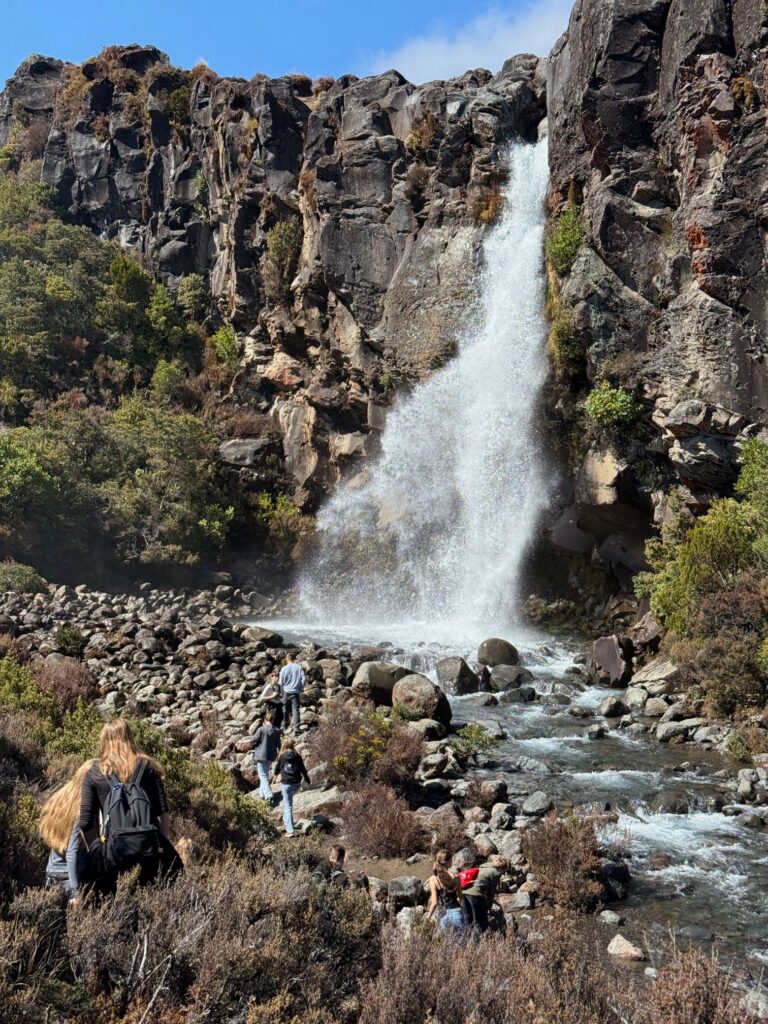 The day started with breakfast at 7:30 a.m. After that, we went on a hike to a waterfall. The path led over rocky ground and through low bushes, and the sound of the water could already be heard from a distance. At the bottom, fine mist rose into the air as the water crashed down onto the rocks. After the hike, we walked back and then drove up the mountain by car. From the top, there was a wide view over the landscape, with snow on the peak and a clear sky above. In the evening, we went bouldering. The climbing hall had many different routes, and everyone was focused on climbing. It was a full and varied day.