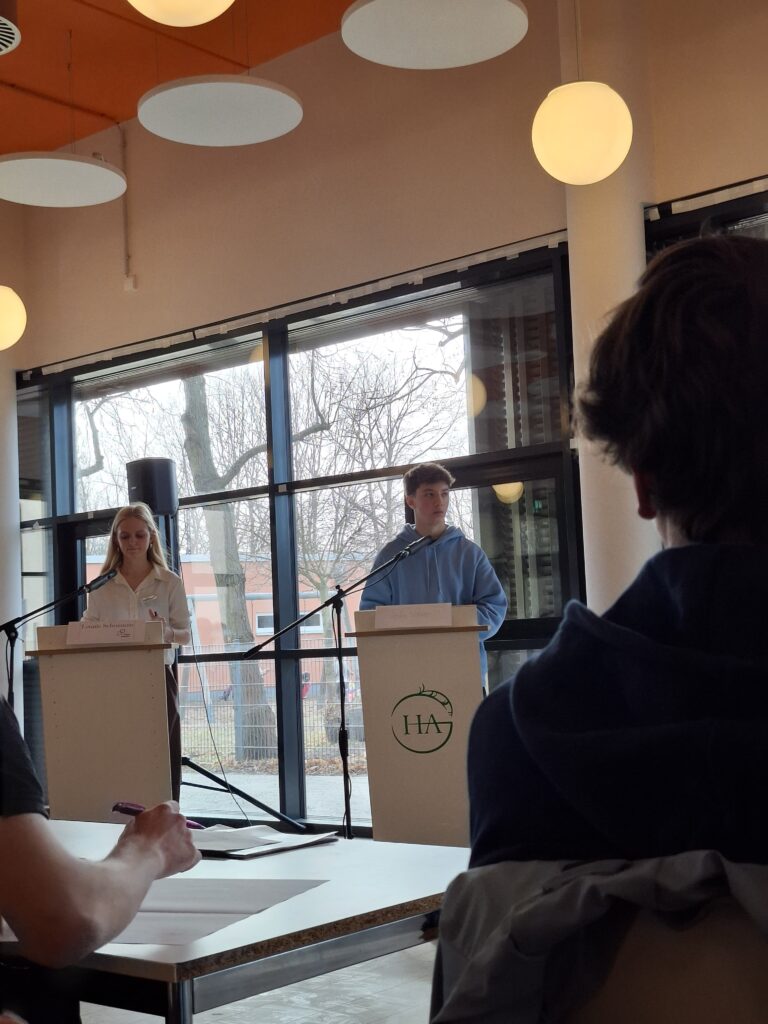 „Soll KI in der Oberstufe für Prüfungen verwendet werden?“ oder „Sollen kaufe gleich, zahle-später-Methoden verboten werden? – das waren beispielhafte Fragen des Regionalwettbewerbs Jugend debattiert, der am 26.02. im Hannah-Arendt-Gymasium stattfand. Wie immer traten unsere Schulsieger*innen der AGI und AGII an, Juror*innen und einige Zuschauer, die nicht nur anfeuerten, sondern auch mit extra Plakaten unterstützten.