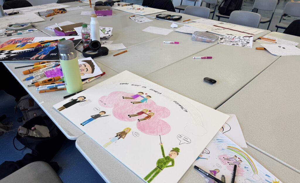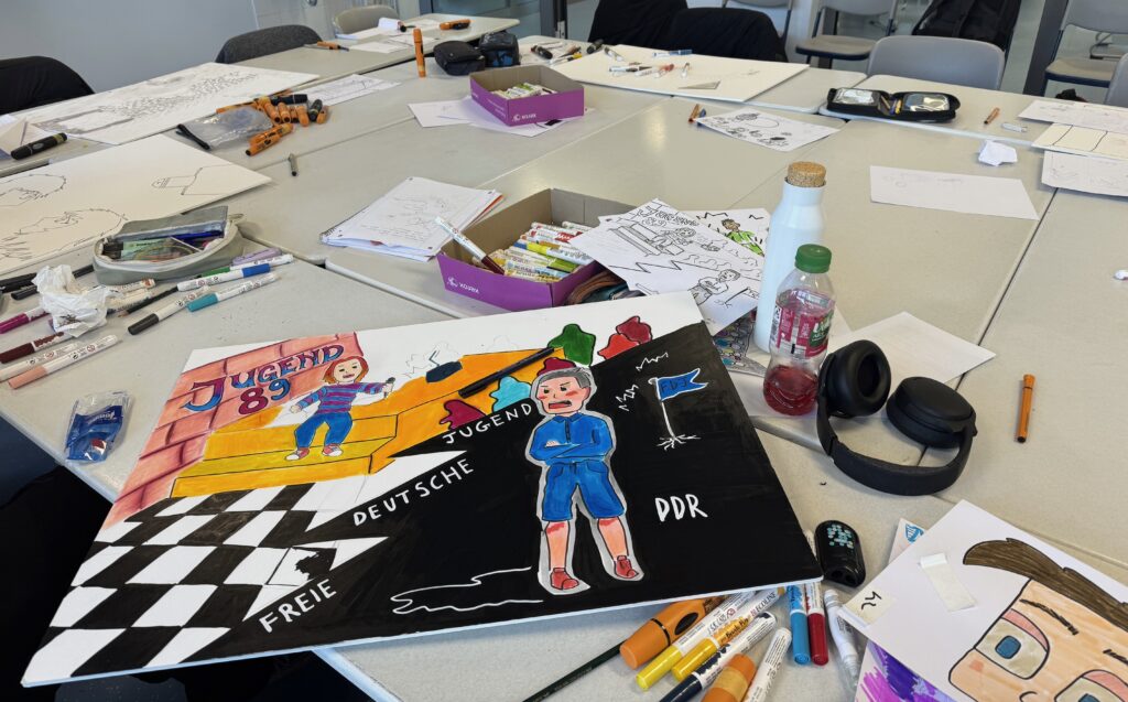 Am nächsten Tag ging der Comic-Workshop weiter. Ziel war es, den Input des vorigen Tages in Form eines Comics zu verewigen. Zuallererst gab es jedoch wieder ein Warm-Up und dazu noch einen kleinen Videoeinstieg, der das Leben der Jugend in der DDR illustrierte. Anschließend führten wir in Kleingruppen ein Brainstorming durch, dessen Ideen wir anschließend in der großen Runde besprachen. Nach der Frühstückspause ging es mit dem Zeichnen auf einer sogenannten „Kapa-Platte“, also dem Endmedium des Comics, weiter. Alle Gruppen haben bis zur Mittagspause fleißig an ihren Comics gearbeitet. Auch nach der Mittagspause wurde circa eine Stunde an den Platten gearbeitet. Zuletzt wurden alle Ergebnisse gezeigt und es fand eine Feedbackrunde zum Workshop statt.