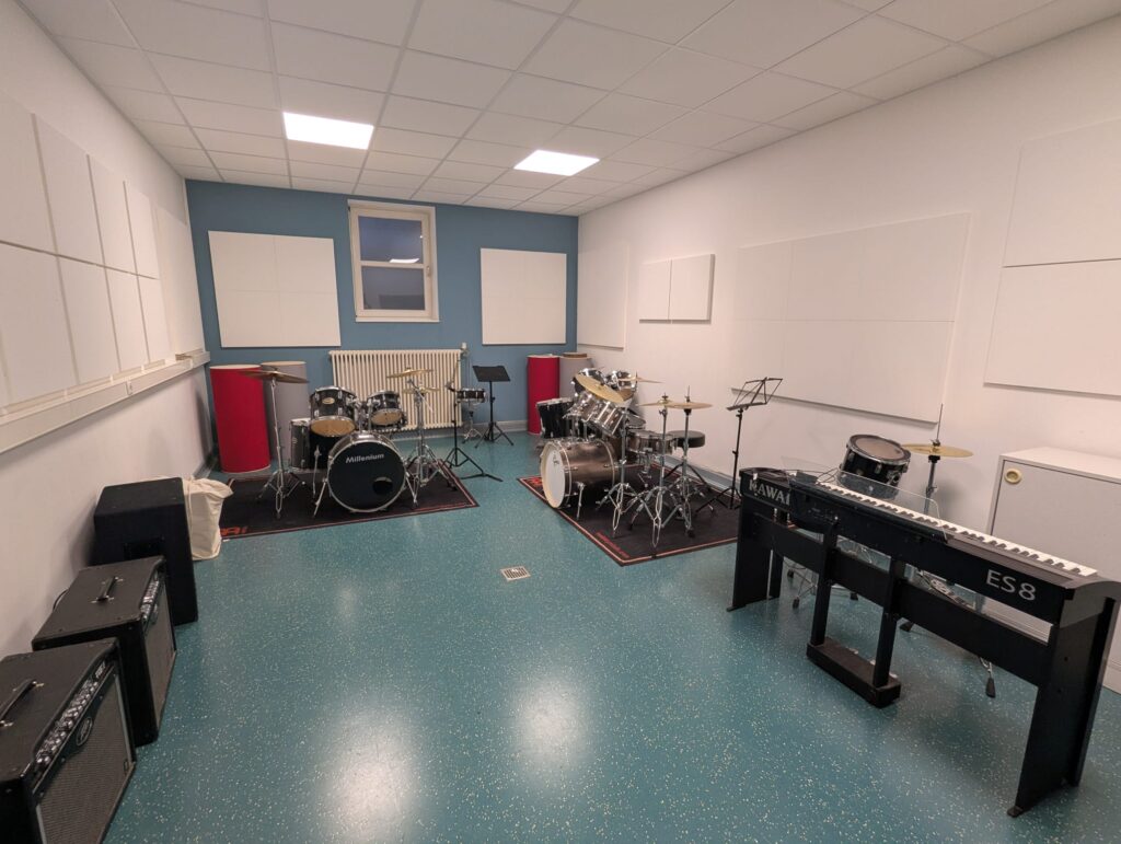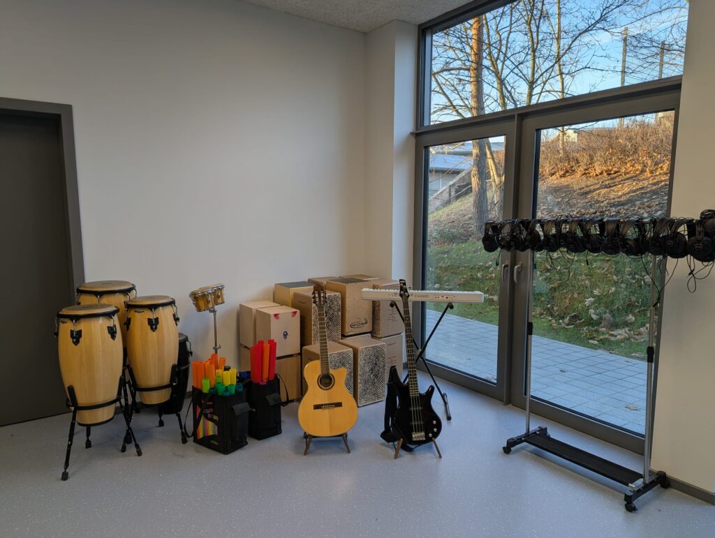 Unsere Musikräume sind sehr gut ausgestattet: Es gibt viele Instrumente zum Ausprobieren und bald auch eine Aula mit großer Bühne für unsere Auftritte.