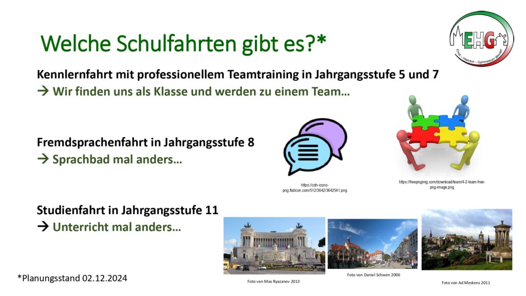 Diese Schulfahrten dienen einerseits dem Kennenlernen und Vertiefen von sozialen Interaktionen, können aber auch besonders für die fachliche Ausbildung genutzt werden. Dies wird u.a. in der Fremdsprachenfahrt Klasse 8 deutlich sowie auch in der Studienfahrt Klasse 11.